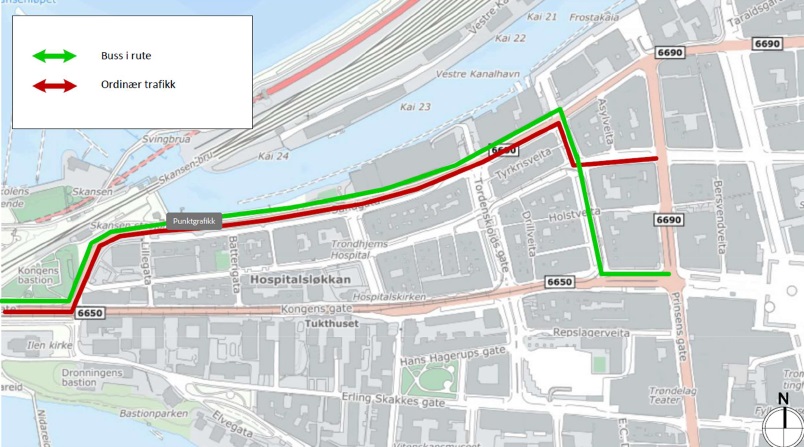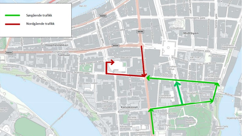 - All biltrafikk som kommer sørfra inn i Prinsens gate og skal til Kalvskinnet eller Leüthenhaven P-hus, må nå ta til høyre inn Bispegata. Deretter må de kjøre Munkegata eller Kjøpmannsgata til Erling Skakkes gate for å følge denne vestover til Kalvskinnet eller Leüthenhaven P-hus.