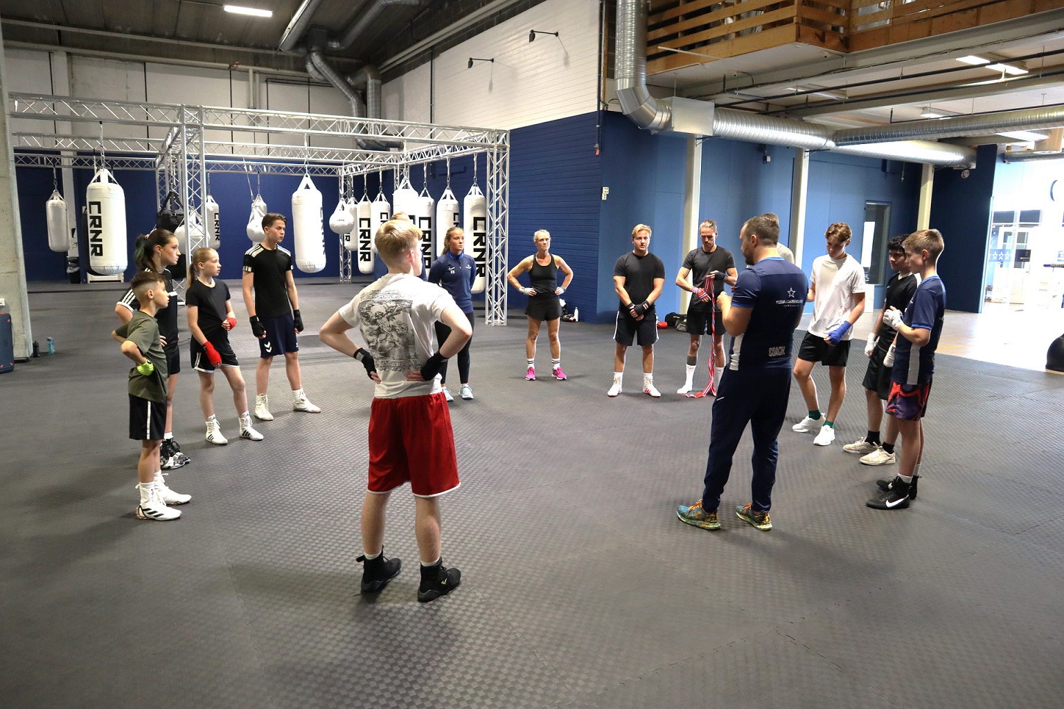 Head Coach Ole-Arne Næsgård (i blå treningsbukse med ryggen til) ønsker velkommen til en ny treningsøkt ved Nova Bokseklubb.