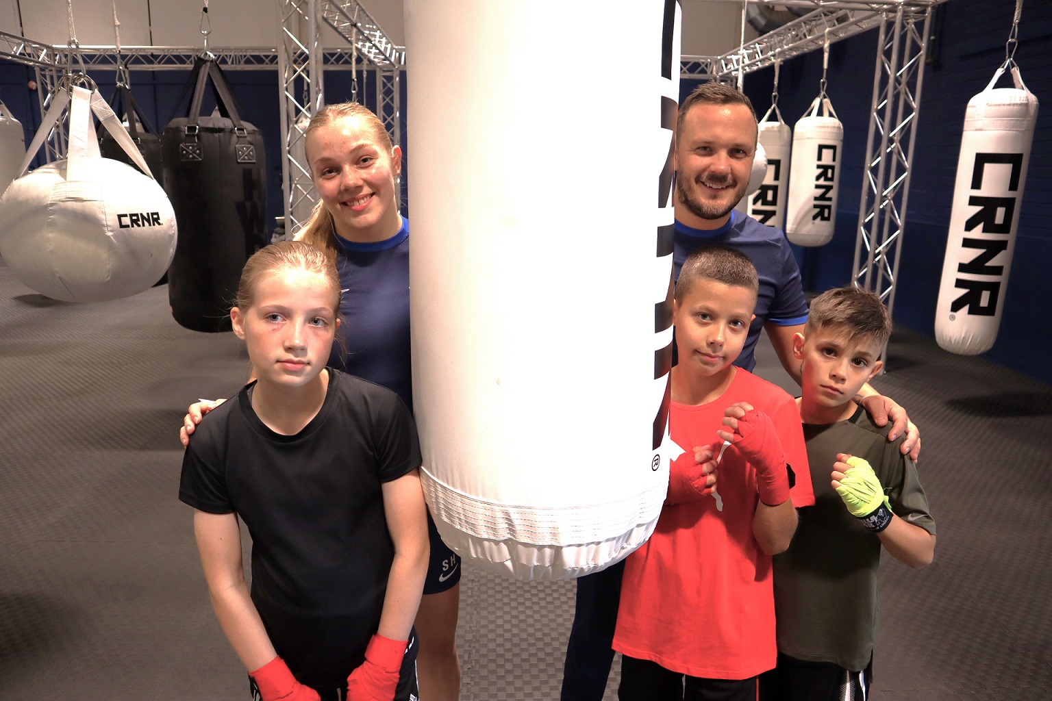 Nina Antonsen Overvik (12), Oskar Antonovas (11) og Cruz Flor (11) stortrives i Nova Bokseklubb på Heimdal. Her sammen med Sunniva Hofstad og trener Ole-Arne Næsgård.