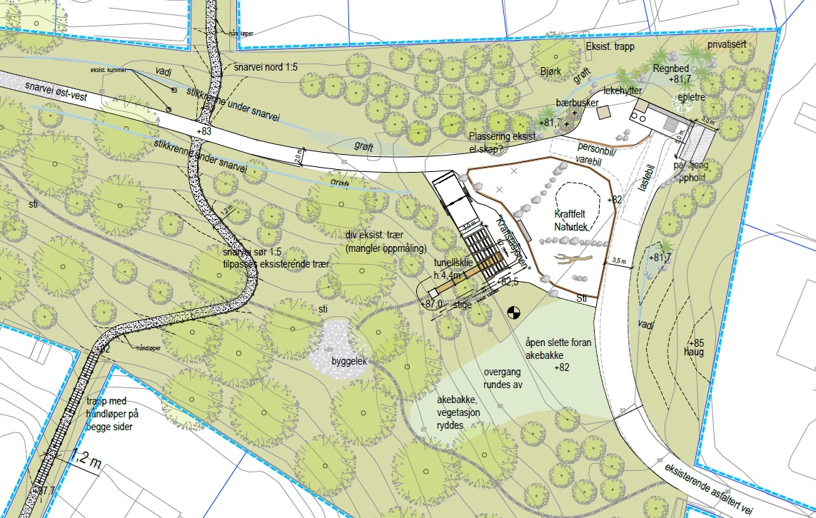 Eksisterende tråkk skal utbedres med ny overbygning, og det planlegges en ny sti gjennom skogen som kobler sammen snarveger og lekeområdet.